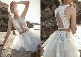 Courtesy of fame and partners. Dress down after your wedding for a night of dancing and fun in a fabulous short reception dress or choose a long formal dress in a slim silhouette for a night to remember. Dressystar women s halter floral lace cocktail party dress hi lo bridesmaid dress.